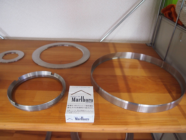 大径のリング形状のものは特殊な6爪チャックでの切削が可能なため、変形を最小に留めての製品造りが可能です。
